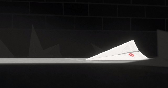 It turns out many of the paper airplanes have collected in a nearby alley, and when the lipstick-marked paper airplane lands among them, they begin to stir and fly from the ground, seeming to come alive, and set off in pursuit of the man. A cloud of paper airplanes forces the man toward a nearby train station and onto a train, much to his confusion. Meanwhile, the lipstick-marked paper airplane sets off in pursuit of the woman, finding her at a flower stand. Recognizing the lipstick-marked paper, the woman chases the airplane to another train station and aboard a different train. The man and woman are finally brought together when both of their trains stop at the same station. They meet on the platform, the man covered in paper airplanes and the woman holding the lipstick-marked paper airplane. As the credits roll, they are seen chatting happily with each other at a restaurant table.